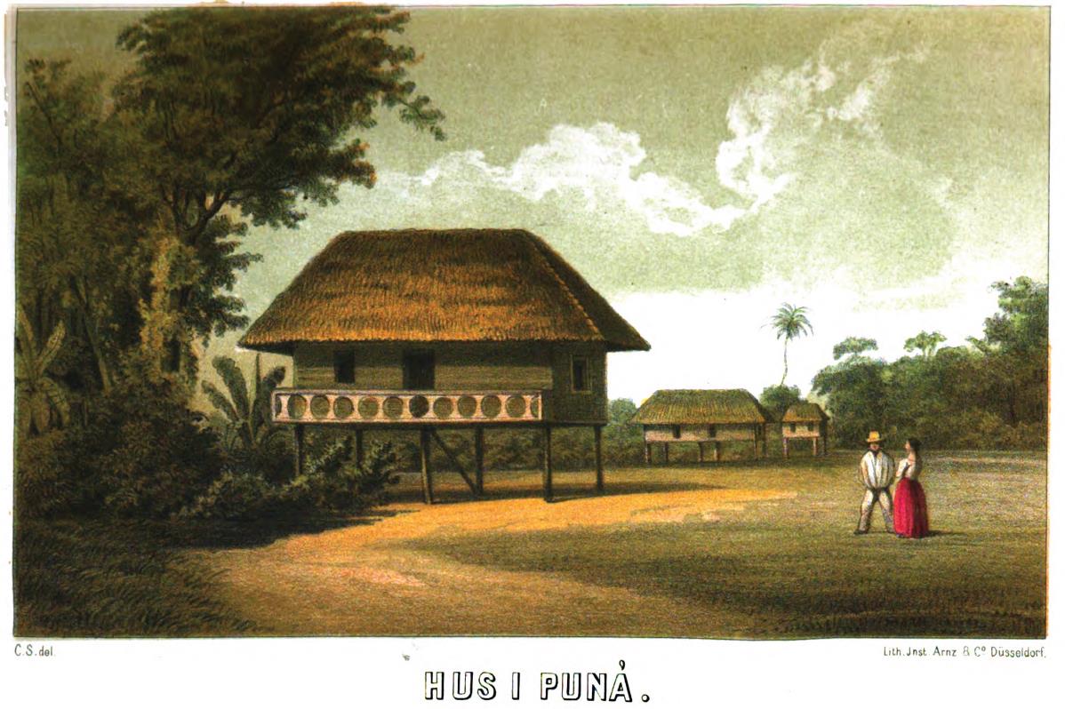 Puná by är belägen på ön af samma namn och består af omkring ett dussin hus med ett par obetydliga inhägnade täppor. Husen äro alla byggda på stolpar, för att gifva luften tillträde på alla sidor och hålla rummen fria från väta. Medföljande planch ger bättre än en beskrifning begrepp om deras utseende, men vi måste upplysa att det här afbildade hus är ett af de bästa i byn. Det inre är öfverallt högst tarfligt: möbleringen består på sin höjd af några stolar och bänkar, ett par hängmattor och en kista. Till spis begagnas några flata stenar, och husgeråden inskränka sig till ett och annat kokkärl och några kalabasser. Några egentliga odlingar syntes ej, oaktadt dylika med största lätthet skulle kunna göras. Någon frukt var ej att få, med undantag af några bananas. En half mil från byn vid Punta Espanola har engelska konsuln i Guayaquil ett landställe, hvarest han en gång försökte odla bomull, som väl vexte förträffligt, men ej kunde skördas i anseende till brist på arbetare, ty Puná-boerne tyckte sådant arbete vara dem alldeles för besvärligt. Från byn går en liten gångväg till detta ställe, men man får dock litet emellanåt tränga sig fram bland de talrika busksnår och slingerväxter, som på många ställen stänga den. En slags ranka, med blad liknande nässlans, var ganska besvärlig, ty dess blad fastnade vid kläderna så starkt att de först efter flera tvättningar voro riktigt borta, och lemnade då efter sig fläckar som tyckas vara outplånliga. För botanisten erbjuder Puná säkert ett rikt fält. Pockenholz och flera arter nyttiga träd växa derstädes i öfverflöd, men skogens täthet gör deras uppsökande och forslande till stranden ganska besvärligt. Bredvid byn genomskäres ön af en smal ränna -- ”estero” -- som en fjerdingsväg från sin mynning grenar sig i två och derefter blir så trång och full med kullfallna träd att endast de minsta båtar kunna komma fram. Denna rännas stränder erbjuda en äkta tropisk scen. De äro beväxta med höga, lummiga träd, mellan hvilkas stammar buskar bilda otillgängliga snår, medan parasitväxter frodas i träden, omslingra deras grenar och bilda stora nedhängande festoner. Vid högt vatten stå de närmast stranden vexande träden med sina rötter i vattnet, men vid lågt -- höjdskillnaden är ungefär en famn -- blir en del af den gyttjiga strandens sluttning synlig tillika med stora sträckor af trädens rötter, hvilka bilda högst fantastiska figurer. Musslor kunna då plockas på buskarnas och mangle-trädens i vattnet slokande grenar. Hägrar, Ibisar och andra vattenfoglar anträffades på stränderna, många småfoglar i buskarna, och understundom såg man en i gyttjan hvilande kayman vid båtens annalkande snabbt kila ned i vattnet. De voro dock hvarken talrika eller stora, men en dag syntes en mycket stor simma kring fregatten. Dess längd kan ej |