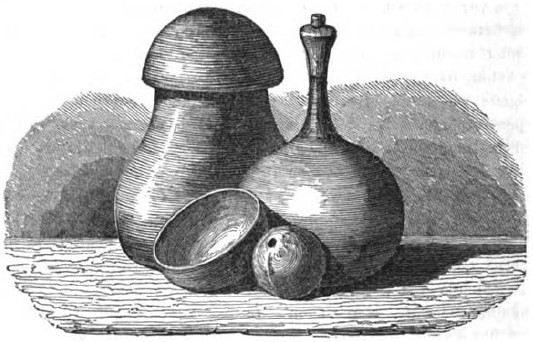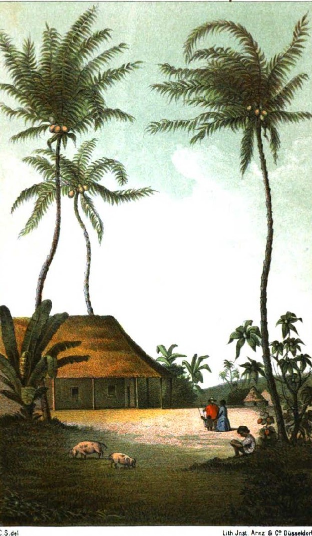 fantastiska kostymer, såsom vest och hatt, men inga benkläder, eller andra i samma stil. Qvinfolkens är bättre; den består af en vid blusklädning, som tillknytes kring halsen och sedan hänger alldeles fri ned till fotknölen. Den har långa och vida ärmar, och är oftast af bomullstyg, men bland de förmögnare ser man den stundom af siden. Färgen är gemenligen brandgul, röd eller grön, ehuru alla andra förekomma. Hufvudet är endast sällan betäckt, och strumpor och skor höra till helgdagsgrannlåten. Håret brukas benadt hängande kring halsen och ej längre än att det räcker till axlarna. Bostäderna äro stackformiga hyddor af gräs och pandanus-trädets blad. Några stråmattor företräda golfs ställe, och hela husgerådet inskränker sig ofta till några andra dylika mattor, samt ett antal större och mindre kalabasser. Sådana finnas af ända till omkring en ankares rymd, och genom på den vexande frukten anbragte omlindningar, gifver man den hvad form man önskar. Sålunda ser man en del skålformiga, andra flaskformiga. De större brukas att deri förvara kläder och dylikt, samt vid tillredandet af "poi". kanakernes nationalrätt. Den tillagas af taro-roten, som för detta ändamål rostas och males till ett något groft mjöl, hvilket med vatten röres till ett slags klister, till färgen hvitt, med liten dragning i blått eller violett. Detta klister arbetas flitigt med händerna och ställes sedan åsido under ett par dagar. Då det börjat komma i jäsning och fått en något syrlig smak, är det färdigt till servering, och såsom bihang dertill hör fisk i fullkomligt rått tillstånd. Spisningen tillgår sålunda: sällskapet sätter sig på huk kring poifatet, hvarje medlem håller en fisk, eller en bit af en sådan, mellan venstra handens tumme och de |