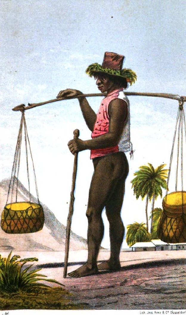 ehuru man måste hafva litet förtroende till sitt öks sedighet och stadga för att äfventyra sig derpå, i synnerhet vid färden utföre. Detta ställe – Pali * – eger utom sin fysiska märkvärdighet äfven en historisk: det var här som den store Kamehameha öfvervann Kalanikupule, höfding öfver Oahu, hvilken efter ett tappert motstånd stupade med en del af sina kämpar, medan andra af fienden trängdes öfver bråddjupets kant och krossades mot klipporna. Åt norr har man härifrån en vidlyftig utsigt öfver ön, men åt motsatt håll är den till följe af dalgångens krökningar alldeles stängd. Oahus högsta bergåsar nå en höjd af omkring 4,000 fot öfver hafsytan. Hawaiiske Öarnes befolkning hör till den stora, öfver de flesta af Stilla Hafvets ögrupper utbredda folkras, som först på de längst åt vester belägna (Nya Hebriderna m. fl.) lemnar rum åt Papuafolken, af några kallad den svarta polynesiska rasen, under det den förre blifvit kallad den bruna. Hawaiierne, eller, som de vanligen benämna sig sjelfva, Kanakerne äro i allmänhet af medelmåttig längd, eller något derunder. Deras kropp är vanligen välbildad, men hufvudet förefaller något stort och tungt mot kroppen, hvartill dock det tjocka yfviga hår, hvaraf det betäckes, torde i ej oväsendtlig mån bidraga. Ansigtets profillinie är oftast temligen lutande, ehuru man stundpm ser personer som hafva den nära lodrät. Hufvudet är vackrare sedt i profil än framifrån, då näsans bredd obehagligt faller i ögonen. * Pannan är temligen lodrät, ögonen rätt ställda och af medelstorlek, näsan ofta något böjd, intryckt vid roten och med starkt utstående näsvingar; dess spets hänger gemenligen något ner. Munnen är bred, med något tjocka läppar, tänderna vanligen starka och friska, kindknotorna temligen utstående. Håret är svart och tjockt, stundom krusigt, stundom rakt; skägget tunnt. Kroppsfärgen är brun med liten blandning af rödt, ungefärligen som en nyligen brungjord bösspipas, innan hon hunnit mörkna. Karlarne se i allmänhet vida bättre ut än qvinnorna, som sällan äro behagliga. Det ligger något tungt och klumpigt i byggnaden af deras hals och axlar; skillnaden i detta afseende mellan dem och europeiska rasens qvinnor visas bäst genom den benämning af "långhalsar", som infödingarne gifvit de sednare. ** Bland höfdingarne förekomma ofta nog kolossala dimensioner, hvarpå vi snart skola anföra exempel. Folkmassans klädedrägt är, som man kan förmoda, temligen enkel. Manfolkets består af ett par linnebyxor och en skjorta, ehuru det ingalunda är ovanligt att endera saknas, och man ser ofta ganska *. Är ej egentligen ett nonien proprium, utan betyder bråddjup eller något dylikt. ** History of the Hawaian Islands by Jarvis, 3:e Edit. Honolulu 1847, sid 112. |