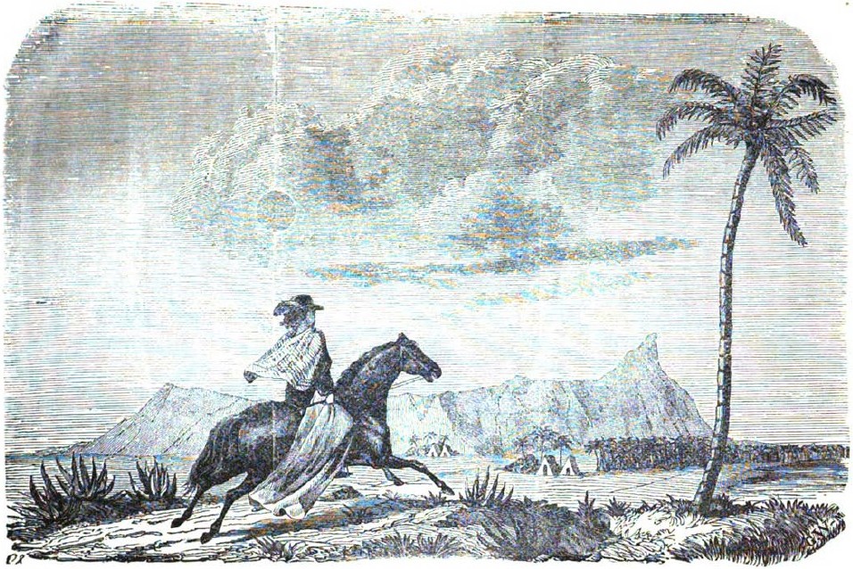 Lördagseftermiddagarne erbjuda Honolulus gator och närliggande vägar ett ganska lifligt skådespel. Alla infödingar, män och qvinnor, som ega eller kunna hyra en häst, begifva sig ut på ridpartier. Qvinnorna rida grensle i vanlig karlsadel, och hafva ben och fötter insvepte i ett långt tygstycke, som hänger ända ned till marken. Detta är stundom af siden, och kostymen fulländas af en tröja af siden eller sammet, eller i dess ställe en med band och broderier utsirad poncho; hufvudet täckes med en lågkullad plyschhatt, beprydd med blommor eller fjädrar. De mindre förmögne nöja sig med bomullsplagg af bjerta färger och en krans kring hufvudet, I staden är det förbjudet att rida hårdt, men man tager skadan igen ute på landsvägen, hvarest det går i flygande fart. Damerna äro lika öfverdådiga som herrarne, och sitta verkligen utmärkt väl till häst. Det är en högst pittoresk anblick att skåda en skock af dessa amazoner i sina mångfärgade drägter och med håret flygande kring axlarne under stoj och skratt komma sättande i fyrsprång utåt hafsstranden, der bränningen skummande bryter sig. Hästarna äro af chilensk och californisk ras, af medelstorlek eller något derunder, men väl byggda, qvicka och uthålliga. Deras hofvar måste vara serdeles fasta och goda. Vi kunna ej påminna oss hafva sett en enda skodd häst; man kan icke destomindre rida i flera timmar på de hårdaste och knaggligaste vägar, utan att hästen synes ömma det ringaste om fötterna eller blifva snubbelfotad. Oaktadt infödingarne äro raska och sadelfasta ryttare, ega de dock föga eller intet begrepp om att rida in en häst, och om man träffar någon hjelpligt inriden, så har denne varit i händerna på någon af de på öarne bosatte Chilener eller Californier. De fleste ridne hästar hafva varit i bruk sedan andra året, och genom oförnuftig behandling blifvit mer eller mindre skadade. Såsom exempel på infödingarnes förstånd i den vägen hafva vi hört uppgifvas, att om en häst skyggar under ryttaren eller annars visar någon odygd, så straffas han ej genast derför, utan saken får anstå till hemkomsten, då djuret bindes vid ett träd och jemmerligen piskas. Om höstarne när den stora hvalfångareflottan anländt är hästarnes svåra tid: de uthyras då till i land varande matroser, som naturligtvis handtera dem högst illa. De blifva sålunda snart utslitne, men ersättas lätt genom andra, ty tillgången är ymnig, och det finnes intet ställe dit de med någon fördel kunna utskeppas, emedan hela vestra kusten af Amerika öfverflödar af dylika af bättre beskaffenhet än de Hawaiiske. Ett par dagar efter ankomsten till Honolulu blefvo samtliga officerare och civile på Eugenie af Förente Staternas chargé d'affaires, herr Allen, inbjudne till ett aftonsällskap, och då man der kunde |
