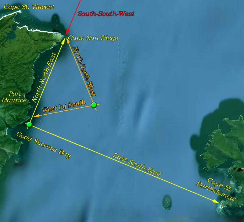 § Assuming the ship was in the vicinity of Port Maurice (now, Caleta San Mauricio), the above Google Earth image shows that Cook's SSW bearing for Cape St. Diego is an apparent error, as indicated by the red line at the top. The ESE bearing to Cape St. Bartholomew is approximately correct, and the bearing to Cape St. Diego must be written as NNE to agree with the ship's approximate position (both indicated by yellow lines). In any case, the corrected bearing indicates a position about 3 miles south of Cook's stated position at Port Maurice.
