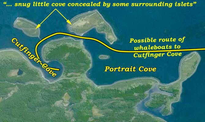 One possible reason that FitzRoy makes no mention of Portrait Cove by name is that this name was not his, but rather that of Landseer, who added it when he created the engraving. The Google Earth detail view above shows a likely location for Portrait Cove.