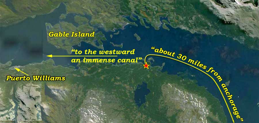 The Google Earth view below shows the northeastern segment of Navarin Island (now, Isla Navarino), with a location (star) that agrees with FitzRoy's description of Cutfinger Cove, and Darwin's “…snug little cove concealed by some surrounding islets.” FitzRoy's reference to cliffs that “…narrow the channel to less than a mile” agrees with the passage between Gable Island and the northern coast of Navarin Island.