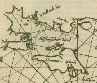 The “Goe Ree” [Good Harbor, and the name of the Dutch port of Goree, from which they sailed] notation may refer either to the large bay to the right of the words, or to the general area along the southern shore of Isla Navarino. In any case, the former is, according to the chart, about 7 Dutch (21 English) miles east of Walbeek's Windhonds Bay. This is quite close to the actual distance between his Windhonds Bay (now, Seno Grandi) and the larger bay now known as Bahía Windhond, all of which are shown in the Walbeek detail view at right.
