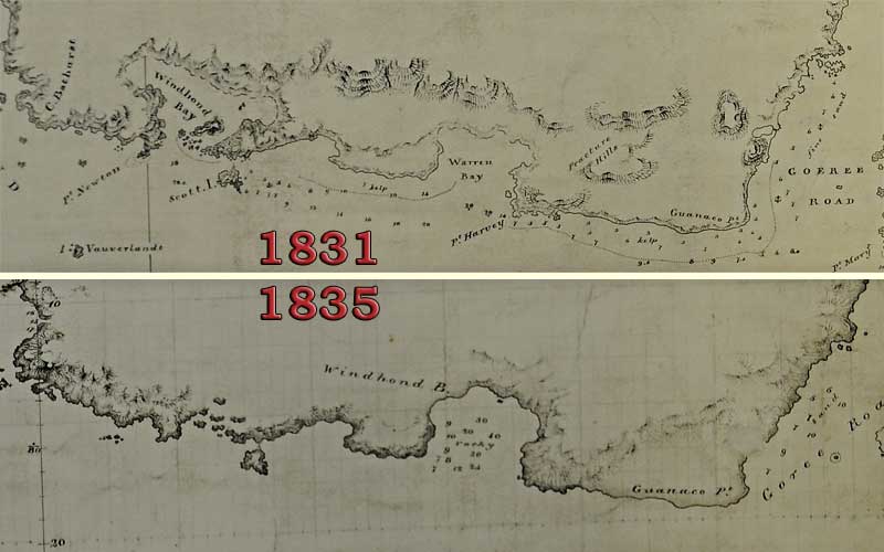 In volume 1 of the Narrative, FitzRoy's May 5, 1830 entry offers evidence that the 1831 chart is correct, and the 1835 chart is not. In sailing westward, he passed through a kelp bed, continued past a low point of land and later saw guanacos feeding near Windhond Bay. The 1831 chart shows kelp notations on either side of Warren Bay, and therefore he was to the west of this bay when he approached the original Windhond Bay.