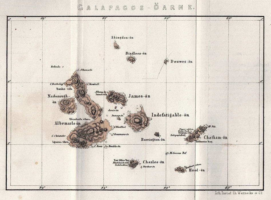 man ser ingen som genom öfvervägande storlek dominerar de öfrige. Vår ankarplats var tre eller fyra mil (1/2 sv. m.) från staden, som på detta afstånd föga faller i ögonen. De oss närmaste holmarne, Perico och Naos, hvilka äro skilda af ett helt smalt sund, äro ett par hundra fot höga, och bevuxne med busksnår och taggiga växter, som betydligt försvåra vandringen. Farallon de San José är en hög och spetsig liten klippa, i hvars skrefvor några örter slagit rot, och på hvilken en mängd sjöfoglar vistas. Den besöktes af våra naturforskare, som derstädes sköto flera foglar, men bränningen, som slår kring den, gör landningen litet obeqväm. På Naos är en sandstrand, hvarest notdrägt med framgång anställdes. Ett stort antal fiskar af många olika former och färger fångades der, så att ej allenast tillräckligt många exemplar erhöllos för förvaring i sprit och uppstoppning, utan gunrummets ledamöter fingo anställa försök till utrönande af åtskilliga slags duglighet i gastronomiskt afseende. De befunnos ganska ätbara, men man måste ock tillägga att sinnesstämningen bland oss var särdeles gynnsam för allt, som kunde bereda någon liten omvexling i matordningen. Utom fisk fångades en mängd krabbor, hvilka talrikt funnos på sandstranden. De voro högröda till färgen, sprungo med en förvånande snabbhet, och blefvo, när de funno sig förföljda, så uppmärksamma och skygga, att man till sluts knappast kunde fånga dem. Flera arter snäckor plockades vid lågt vatten i sanden och bland klipporna; der vatten stadnat i dessas håligheter träffade man en mängd små fiskar af en half till en tums längd. Dessa omständigheter gjorde Naos till en rätt omtyckt promenadplats, oaktadt de från den hvita sanden återkastade solstrålarne betydligt ökade hettan, som förut var kännbar nog med solen i zenith vid middagen och en temperatur af 29°--30° i skuggan. Snart sparade också infödingarne oss besväret med snäckors samlande, i det de kommo ombord med sådana af åtskilliga slag och i stort antal, och de fingo på dem god afsättning. Förmånligast föll det sig att som bytesmedel använda en gammal skjorta eller ett par skrala benkläder, båda delarne artiklar, hvarmed våra snäckfiskare voro temligen anspråkslöst utstyrde. |