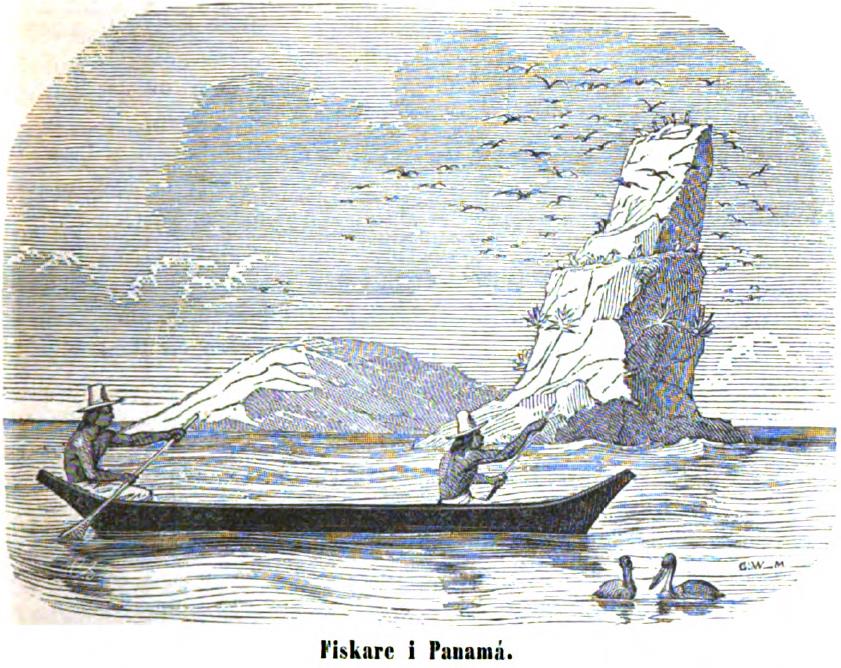 man ser ingen som genom öfvervägande storlek dominerar de öfrige. Vår ankarplats var tre eller fyra mil (1/2 sv. m.) från staden, som på detta afstånd föga faller i ögonen. De oss närmaste holmarne, Perico och Naos, hvilka äro skilda af ett helt smalt sund, äro ett par hundra fot höga, och bevuxne med busksnår och taggiga växter, som betydligt försvåra vandringen. Farallon de San José är en hög och spetsig liten klippa, i hvars skrefvor några örter slagit rot, och på hvilken en mängd sjöfoglar vistas. Den besöktes af våra naturforskare, som derstädes sköto flera foglar, men bränningen, som slår kring den, gör landningen litet obeqväm. På Naos är en sandstrand, hvarest notdrägt med framgång anställdes. Ett stort antal fiskar af många olika former och färger fångades der, så att ej allenast tillräckligt många exemplar erhöllos för förvaring i sprit och uppstoppning, utan gunrummets ledamöter fingo anställa försök till utrönande af åtskilliga slags duglighet i gastronomiskt afseende. De befunnos ganska ätbara, men man måste ock tillägga att sinnesstämningen bland oss var särdeles gynnsam för allt, som kunde bereda någon liten omvexling i matordningen. Utom fisk fångades en mängd krabbor, hvilka talrikt funnos på sandstranden. De voro högröda till färgen, sprungo med en förvånande snabbhet, och blefvo, när de funno sig förföljda, så uppmärksamma och skygga, att man till sluts knappast kunde fånga dem. Flera arter snäckor plockades vid lågt vatten i sanden och bland klipporna; der vatten stadnat i dessas håligheter träffade man en mängd små fiskar af en half till en tums längd. Dessa omständigheter gjorde Naos till en rätt omtyckt promenadplats, oaktadt de från den hvita sanden återkastade solstrålarne betydligt ökade hettan, som förut var kännbar nog med solen i zenith vid middagen och en temperatur af 29°--30° i skuggan. Snart sparade också infödingarne oss besväret med snäckors samlande, i det de kommo ombord med sådana af åtskilliga slag och i stort antal, och de fingo på dem god afsättning. Förmånligast föll det sig att som bytesmedel använda en gammal skjorta eller ett par skrala benkläder, båda delarne artiklar, hvarmed våra snäckfiskare voro temligen anspråkslöst utstyrde.
