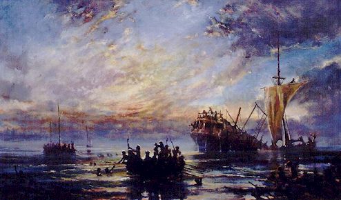 So the longest night of the prisoners lives began; a night of unbelievable terror and waiting. The ship rolled and shackles bit their flesh, from time to time some cried out for mercy or just relief. Three panicked and actually managed break free. Torn, bleeding and desperate they waited their chance huddled close beneath the hatch. At two o'clock a sentry checked and discovered them to be loose and just managed to slam down the hatch. He reported to Lieutenant Hayward who, under the muzzles of marine muskets, had the three sobbing men brutally re-shacked.