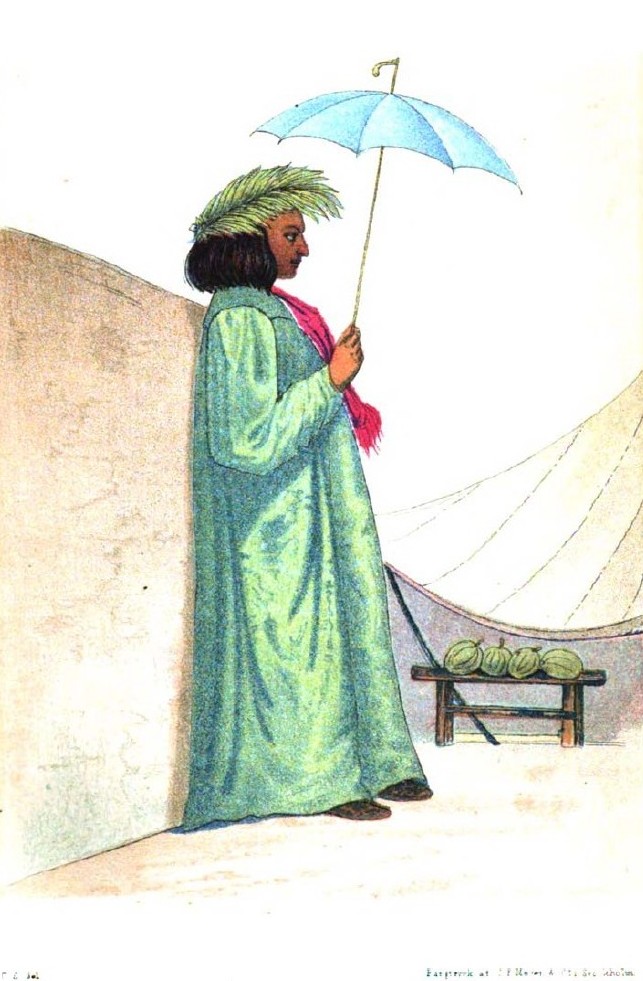 Den 26 Juni hade Eugenies chef, tillika med officerarne och de civile, audiens hos Hans Maj:t Kamehameha den tredje, konung öfver Hawaiiska Öarna. Han eger ett ganska vackert hus i Honolulu, i hvilket ceremonien försiggick, naturligtvis hade vi så mangrannt som möjligt infunnit oss. Vid trappan var en liten afdelning af konungarikets ett par hundra man starka krigshär, uppställd: vi emottogos af utrikes-ministern, herr Wyllie, och infördes i ett ganska elegant möbleradt förmak, hvarest vi omkring en half timme väntade på konungens ankomst. Audiensen försiggick i ett rymligt och vackert rum. Kommendör-kapiten Virgin höll till konungen på engelska ett tal, hvari omnämndes de orsaker, som bragt Eugenie till de Hawaiiska Öarna, och Sveriges konungs höga önskan, att de svenska eller norrska fartyg, hvilka möjligen kunde komma att besöka öarna, måtte erhålla de förmåner, som redan genom ömsesidig traktat blifvit tillerkända åtskilliga andra nationers. Undervisnings-ministern, herr Armstrong, öfversatte vår chefs tal på hawaiiska språket, samt tolkade H. Maj:ts på detta språk gifna svar *. Derefter presenterades för H. Maj:t Eugenies alla närvarande officerare, civile och vetenskapsmän, hvarpå H. Maj:t, som förut varit stående, satte sig ned, hvilket exempel följdes af de flesta af de närvarande. Man kunde nu litet noggrannare betrakta rummet och personerne. Kamehameha är en medelålders man **, till vexten af medelstorlek med något anlag för fetma. Hans anletsdrag äro äkta polynesiska, och färgen temligen mörk, men hans utseende är ingalunda ofördelaktigt. Under talen och presentationen såg han mycket besvärad och förlägen ut, men sedan dessa ceremonier väl voro öfverståndne, blef han alldeles en annan menniska, och sprakade genom tolk mycket med kommendör-kapiten Virgin. I sällskaper, der etiketten kan läggas åsido, skall han vara både språksam och artig. Han var klädd i galonerade underkläder af hvitt kasimir och blå frack med en massa guldbroderier; på hans bröst prålade en inhemsk ordenskraschan, men vi kunna ej uppgifva ordens namn eller beskaffenhet. Samma orden bars af några af de närvarande, såsom de båda prinsarne, Keoni Ana, Paki, Kehuanaoa och ett par andra personer, hvars namn vi ej känna. Alla de nämnda personerna äro redan en gång beskrifne. Finans-ministern, doktor Judd, var ej vid tillfället närvarande, icke heller drottningen eller någon af hennes hof. Rummet var stort och vackert samt ganska väl möbleradt. Midt på golfvet stod ett bord, på hvilket åtskilliga böcker och planchverk *. En öfversättning deraf finnes bland bilagorna. ** Född 1814. Han heter egentligen Kauikeaouli. |